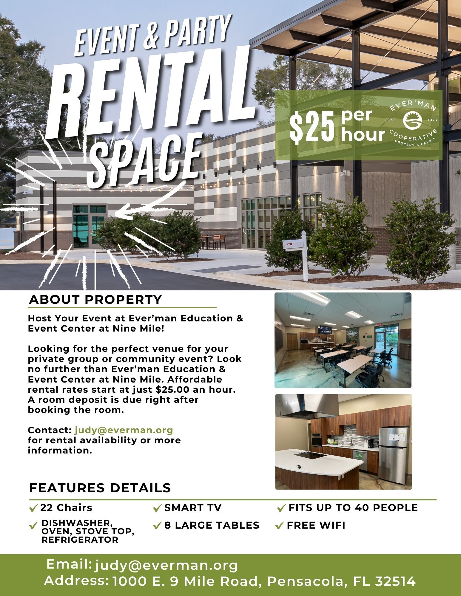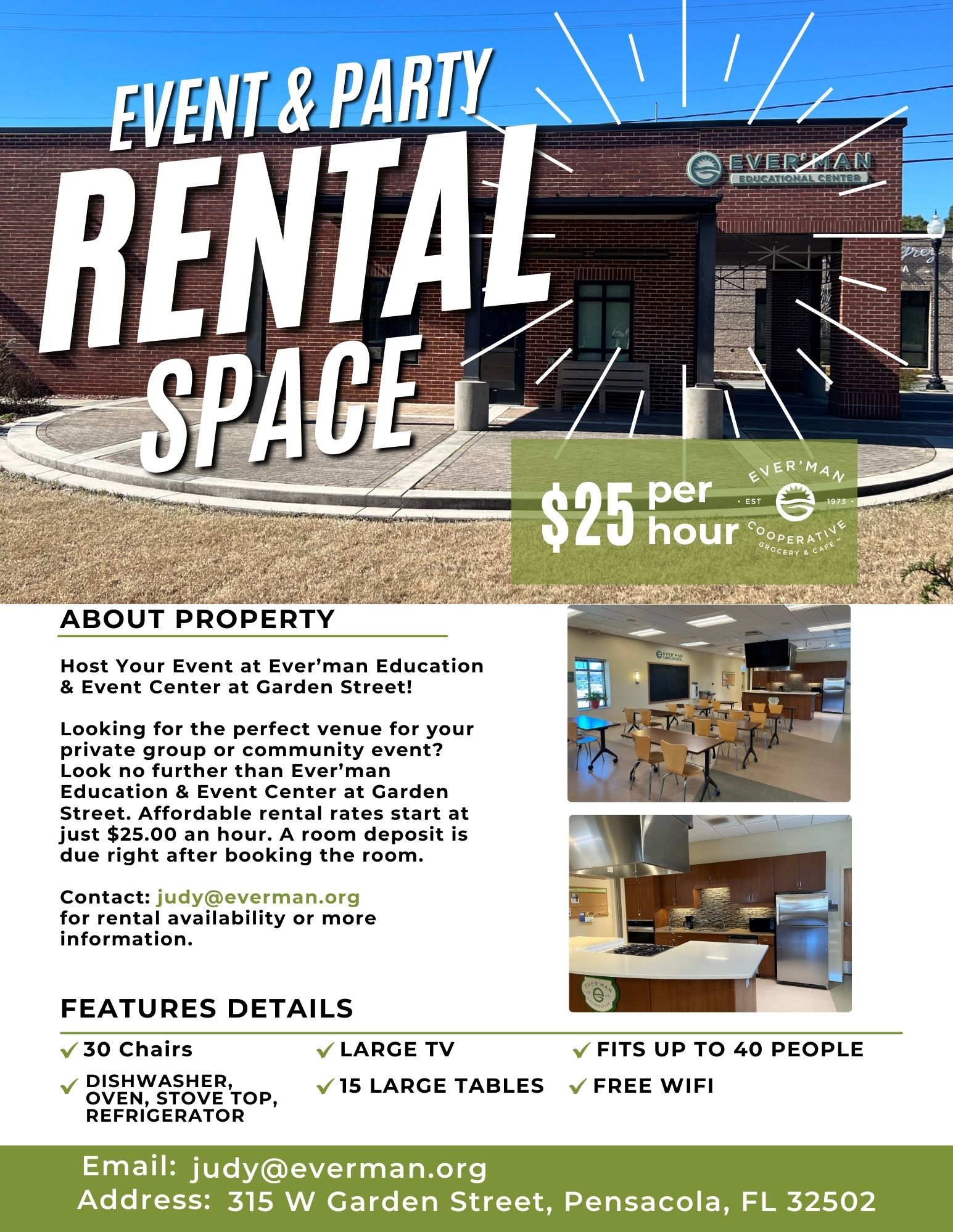 Room Rental available: contact judy@everman.org